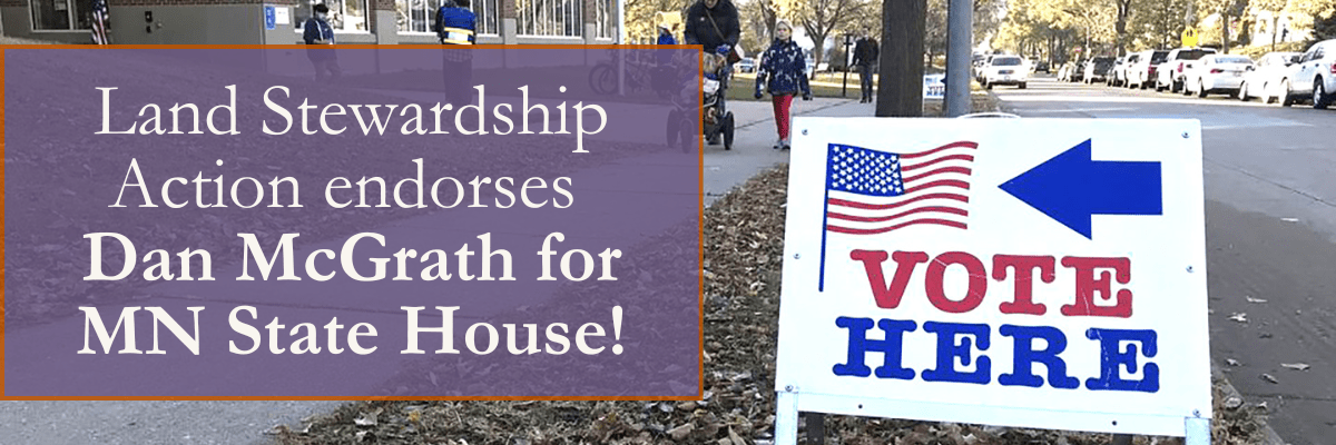 When you do vote, we encourage you to cast your vote for Dan McGrath for State Representative in District 64A. Land Stewardship Action has endorsed Dan because he will be a leader from day one. Dan has led progressive grassroots campaigns for decades. He is an organizer. He brings people together through the kind of relationship building, dialogue, and gentle leadership that represent the best of democratic ideals. And just as important, he knows how to win on issues including affordable health care, quality public schools, and a fair shake for all working families.